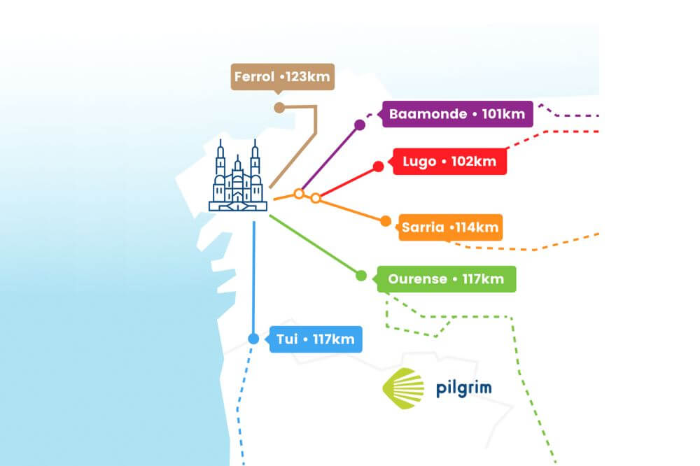 We’ll see now a map based on the different Ways with the strategy points that will help us to walk/ride the minimum distance required to get The Compostela.