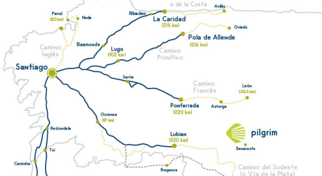 Successivamente, possiamo osservare una mappa dove sono segnalati i punti strategici per percorrere la distanza minima che permette di ottenere la Compostela, sia a piedi che in bicicletta, a seconda del Cammino che si vuole realizzare.